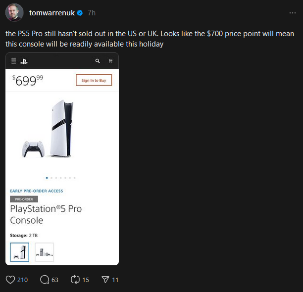 arrow-up1453arrow-down1image[Tom Warren] The PS5 Pro still hasn’t sold out in the US or UK. Looks like the $700 price point will mean this console will be readily available this holidaylemmy.world2pt_perversion@lemmy.world to Games@lemmy.worldEnglish · 1 day agomessage-square228fedilink