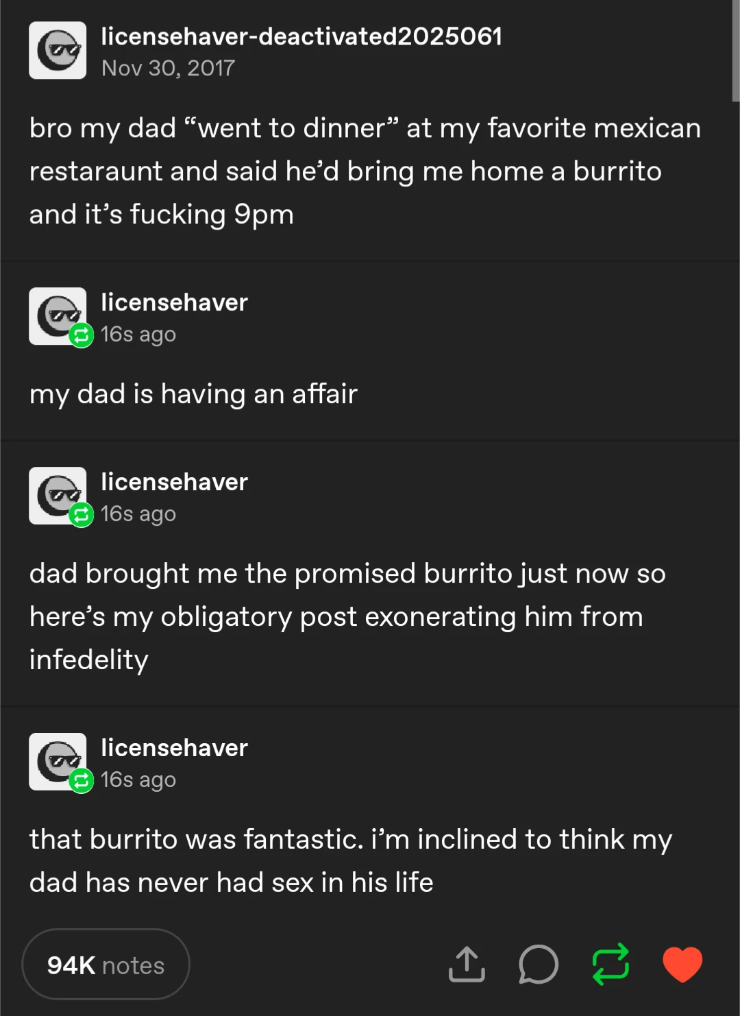 arrow-up1269arrow-down1imageDad left for the burrito lemmy.blahaj.zoneInterstellar_1@lemmy.blahaj.zoneEnglish · 2 months agomessage-square8linkfedilink