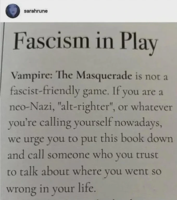 PugJesus@piefed.socialEnglish · 3 天前Based Vampire the Masquerade media.piefed.socialimagemessage-square71linkfedilinkarrow-up1830arrow-down114
