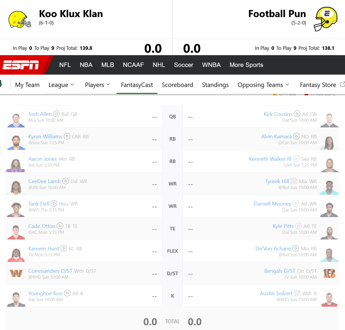 I’m almost certainly going to win. 144.5 vs. 86.6 (115.8 projected total). He would need Cade Otten and Kareem Hunt to combine for 60.
