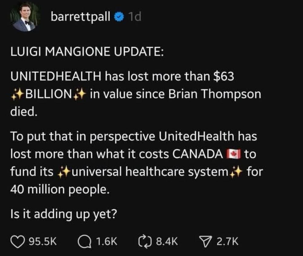 Doing the math, UnitedHealth’s net worth before the bullets was very close to enough they could provide universal healthcare to all of the US alone.