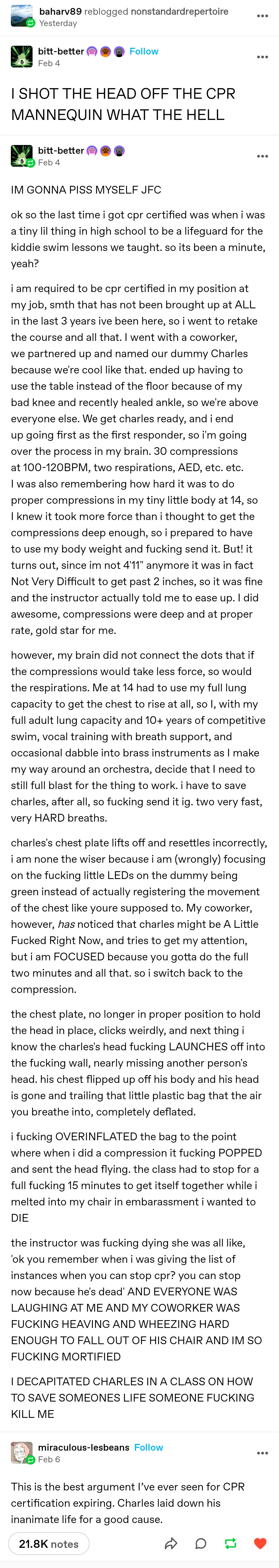 i am required to be cpr certified in my position at my job, smth that has not been brought up at ALL in the last 3 years ive been here, so i went to retake the course and all that. I went with a coworker, we partnered up and named our dummy Charles because we’re cool like that. ended up having to use the table instead of the floor because of my bad knee and recently healed ankle, so we’re above everyone else. We get charles ready, and i end up going first as the first responder, so i’m going over the process in my brain. 30 compressions at 100-120BPM, two respirations, AED, etc. etc. I was also remembering how hard it was to do proper compressions in my tiny little body at 14, so I knew it took more force than i thought to get the compressions deep enough, so i prepared to have to use my body weight and fucking send it. But! it turns out, since im not 4’11" anymore it was in fact Not Very Difficult to get past 2 inches, so it was fine and the instructor actually told me to ease up. I did awesome, compressions were deep and at proper rate, gold star for me.