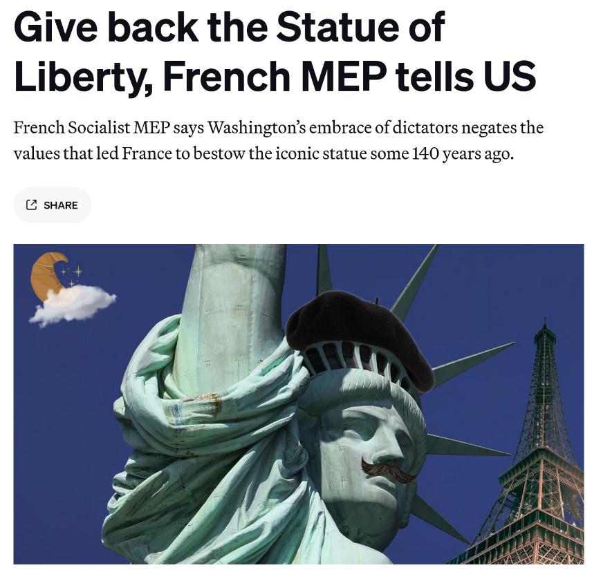 So they see an authoritarian rushing towards fascism in opposition of the will of the voters to protect capitalists from rising leftism, and decided the Statue of Liberty would be more at home with an authoritarian rushing towards fascism in opposition of the will of the voters to protect capitalists from rising leftism… but in Europe!