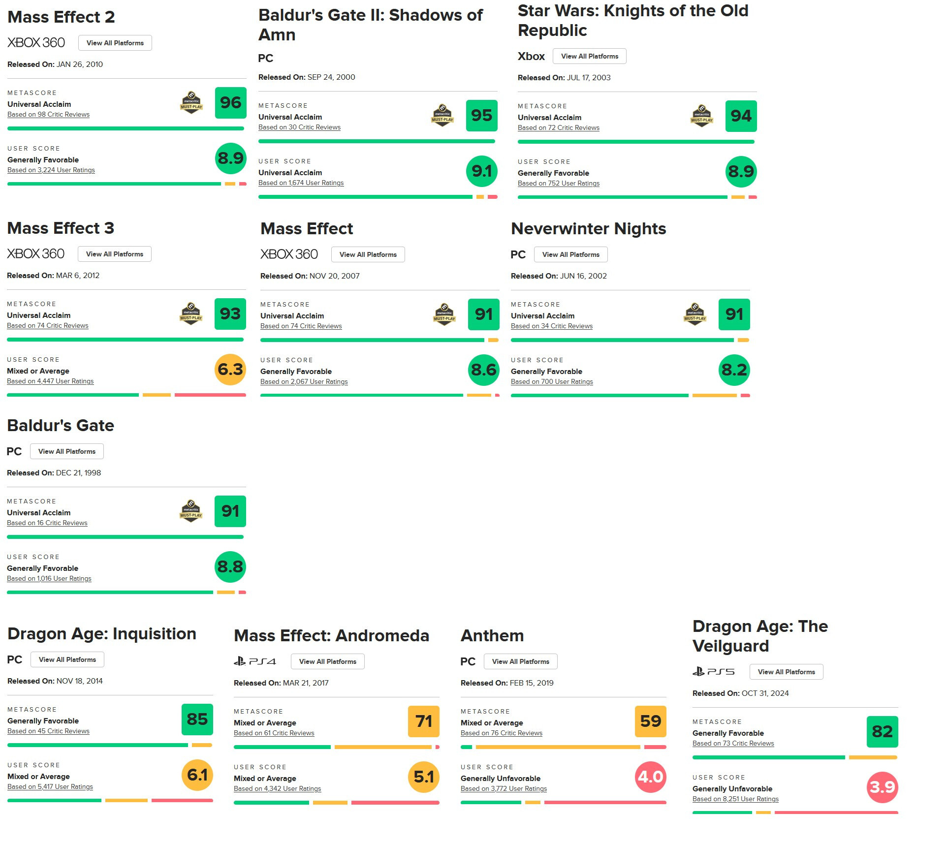 hell, almost all of BioWare’s games on Steam are “Mostly positive” except for Dragon Age 2 and Veilguard which are both “Mixed”