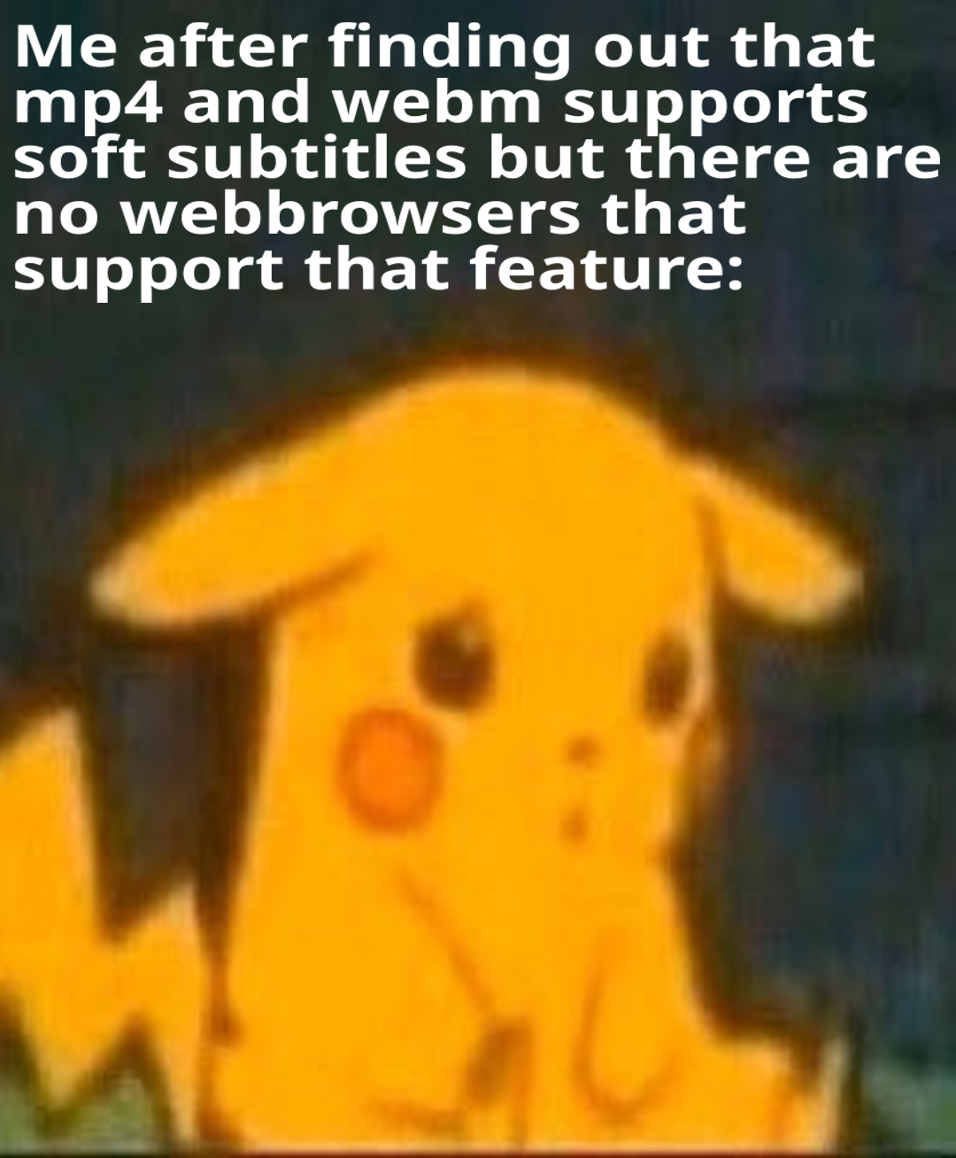 arrow-up1567arrow-down1imageWebm supports multiple audio and subtitle tracks inside its RIFF container structure, why the hell arent browsers supporting it???sh.itjust.workseinfach_orangensaft@sh.itjust.works to Programmer Humor@programming.dev · 9 months agomessage-square43linkfedilink
