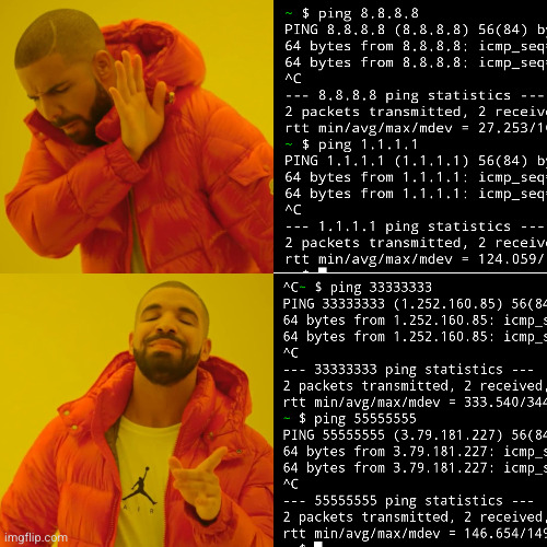 ping 1.1also works. It resolves to 1.0.0.1, which is Cloudflare’s secondary DNSOh shit. Didn’t know this either. Kind of like ipv6 in a way