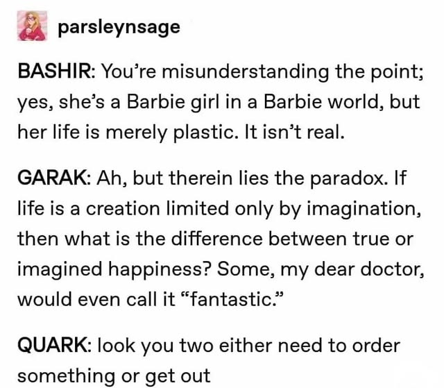 Thus, Barbie’s world may be a view of our (shared) reality, or it may be entirely fictional, but it is definitely real, down to the sentient nutcracker.