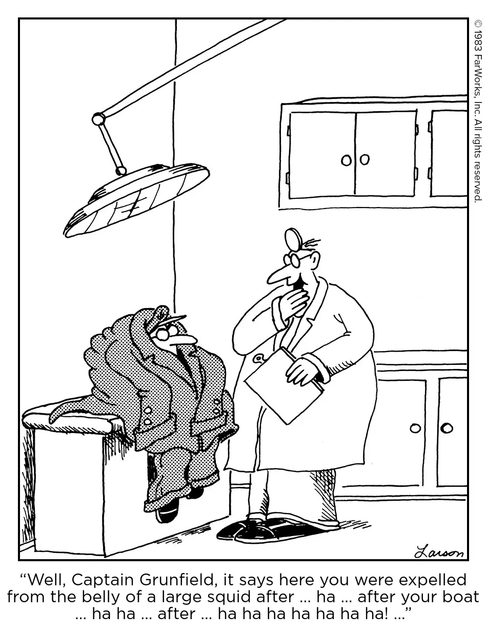 “Well, Captain Grunfield, it says here you were expelled from the belly of a large squid after … ha … after your boat … ha ha … after … ha ha ha ha ha ha ha! …”