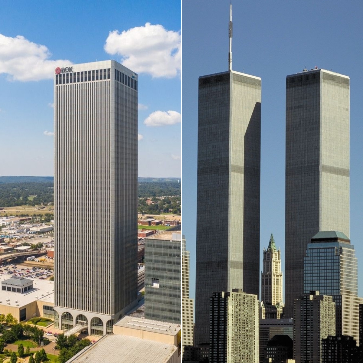 BOK Tower (originally One Williams Center) was constructed in 1976 for The Williams Companies Inc. a petroleum producer in Tulsa, Oklahoma. John Williams, the CEO at the time, liked the look of the recently completed World Trade Center so much that he hired the original architect to build essentially a half-scale version of WTC Tower 1.