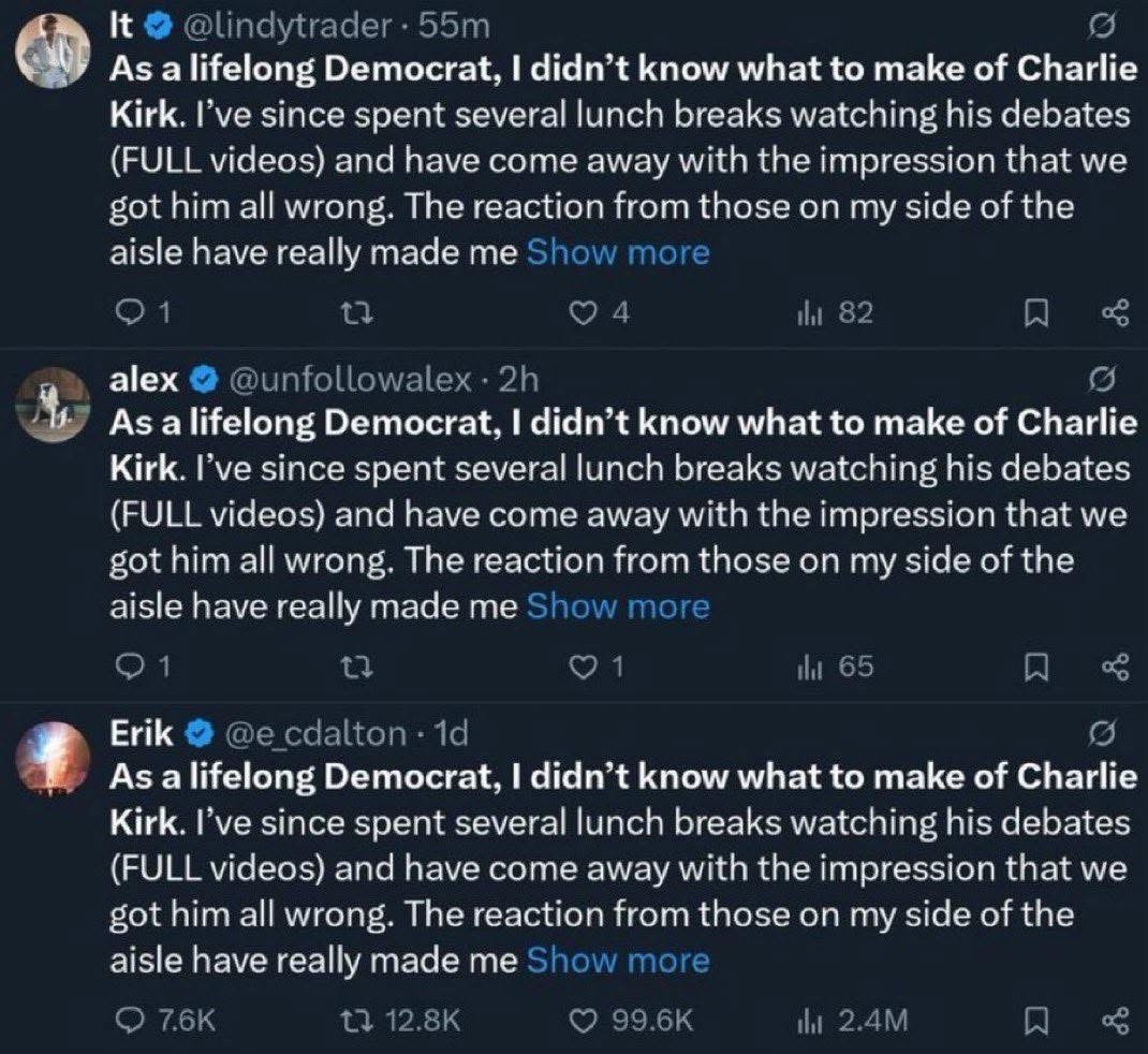 Russian and Chinese bots used to out themselves with weird cultural misunderstandings of western countries all the timeThat’s giving them too much credit, I’m sure many of these are also Republicans pretending to be Democrats. After all, it’s what Kirk would’ve done