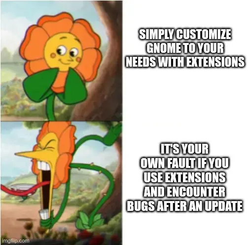 GNOME only makes it possible to make Extensions via directly patching shell code and refuses to create an API. They can say whatever they want, this way of doing things is inherently unstable and will always break at some point, and it’s not primarily the fault of extension devs or users if that happens given there literally is no other way of doing it. Even something as simple as the RunCat extension is potentially able to crash your whole desktop. This is comparable to every single modification you do in KDE being a KWin script (that settings window does have a warning in front of it for a reason). Another comparison: This is also similar to how Firefox did Extensions until they adopted the common extension API in Firefox 3 (?), before then that browser was known to be crashing a lot and become sluggish quickly since any extension was monkey-patching code into it - exactly what Gnome extensions do to work.