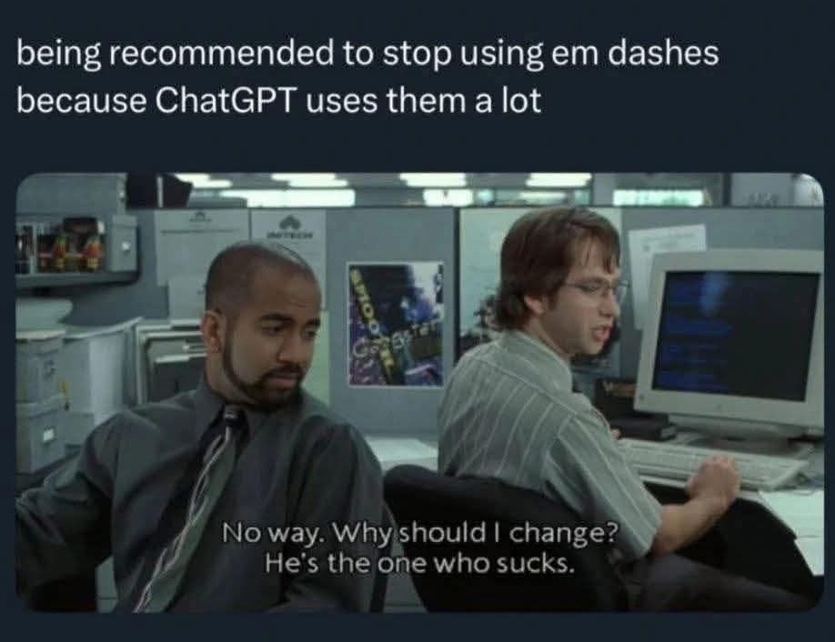 I have 20 years of typography muscle memory and styleguide rules that dictate proper use of em and en dashes. I’m not dumbing it down. If people can’t tell AI from human writing we’re truly cooked and it won’t be because of punctuation.