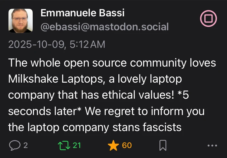 The whole open source community loves Milkshake Laptops, a lovely laptop company that has ethical values! 5 seconds later We regret to inform you the laptop company stans fascists