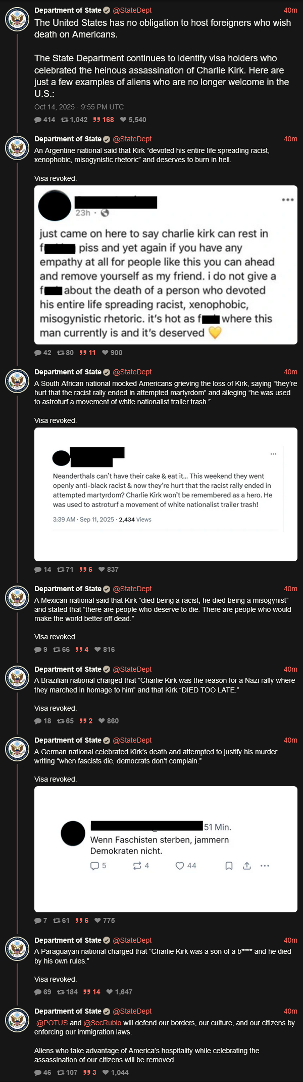 https://xcancel.com/StateDept/status/1978218112882266594#m https://apnews.com/article/trump-charlie-kirk-visas-revoked-455f43467c0c50e84d3857c1e9c81458 https://www.reuters.com/world/us/us-revokes-visas-six-foreigners-over-comments-made-about-charlie-kirks-death-2025-10-14/