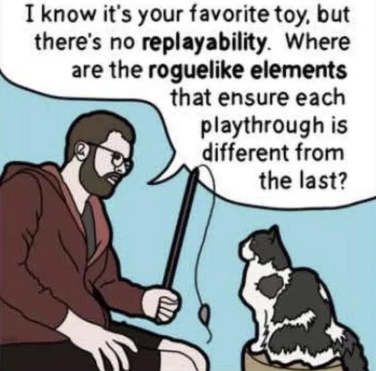 The cat should be allowed to select from different wands, strings, and attachable toys, then play in randomly generated arenas with different treat loadouts and procedurally generated hiding spots.