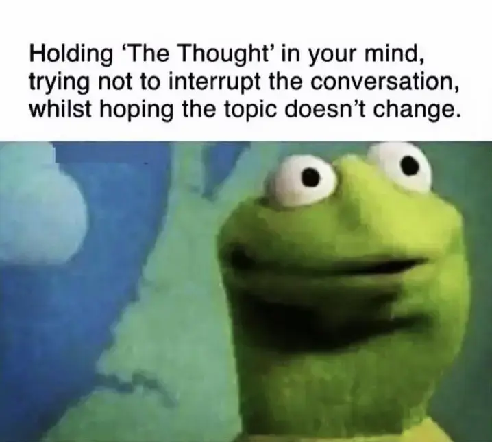Sometimes I wonder how much this is a symptom of AuDHD specifically. ADHD people cannot hold “The Thought” but often just go with the flow anyway and it’s not as important. ASD peeps can hold “The thought” and feel the pressure to express it. AuDHD people simultaneously cannot hold it and feel the pressure to express it.