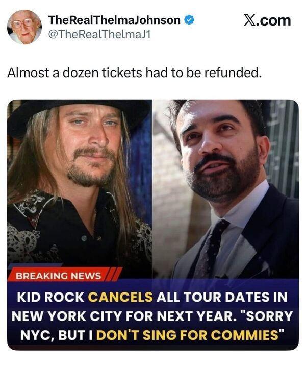 Kid Rock doesn’t know what a communist is, let alone a democratic socialist, but I’m pretty sure New Yorkers know what a MAGA shit-eater is and are 💯% okay with him not coming to NYC for an entire year.