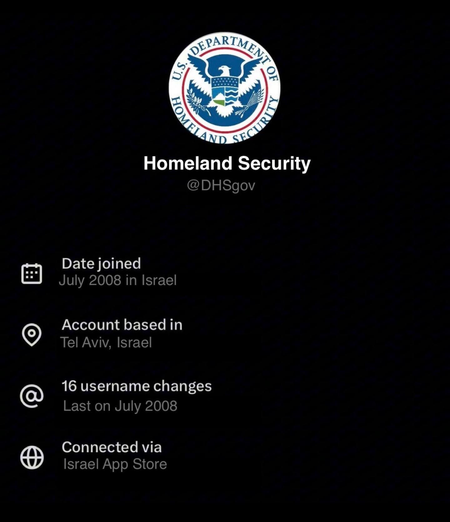 arrow-up1150arrow-down1imagetwitter briefly allowed people to see where each account was operated from. turns out, the official DHS account is run from Tel Avivlemmy.mlSpectre@lemmy.ml to United States | News & Politics@lemmy.ml · 4 months agomessage-square16linkfedilink cross-posted to: us_news@lemmygrad.ml