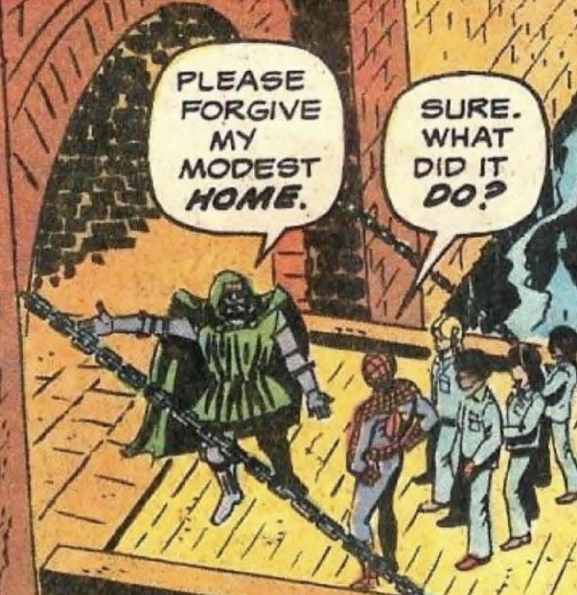 Banter friendlier Dr. Doom: “It prevented ruffians from sieging earlier, so it needs time to clean up the mess.” ∗pads Spidey’s right shoulder jovially∗