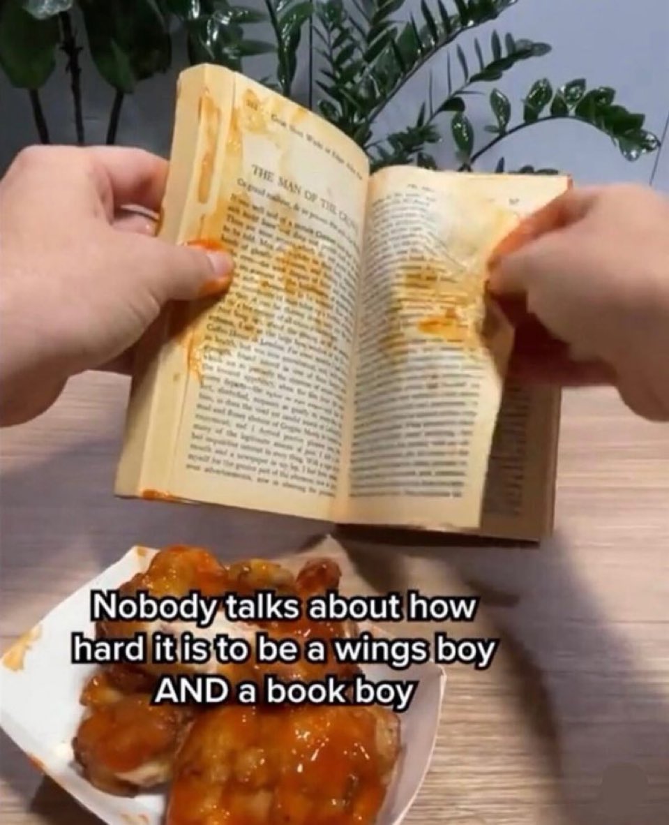 I’m not even a book person and this killed me a little. I am a wing person though. Why would you waste the sauce?