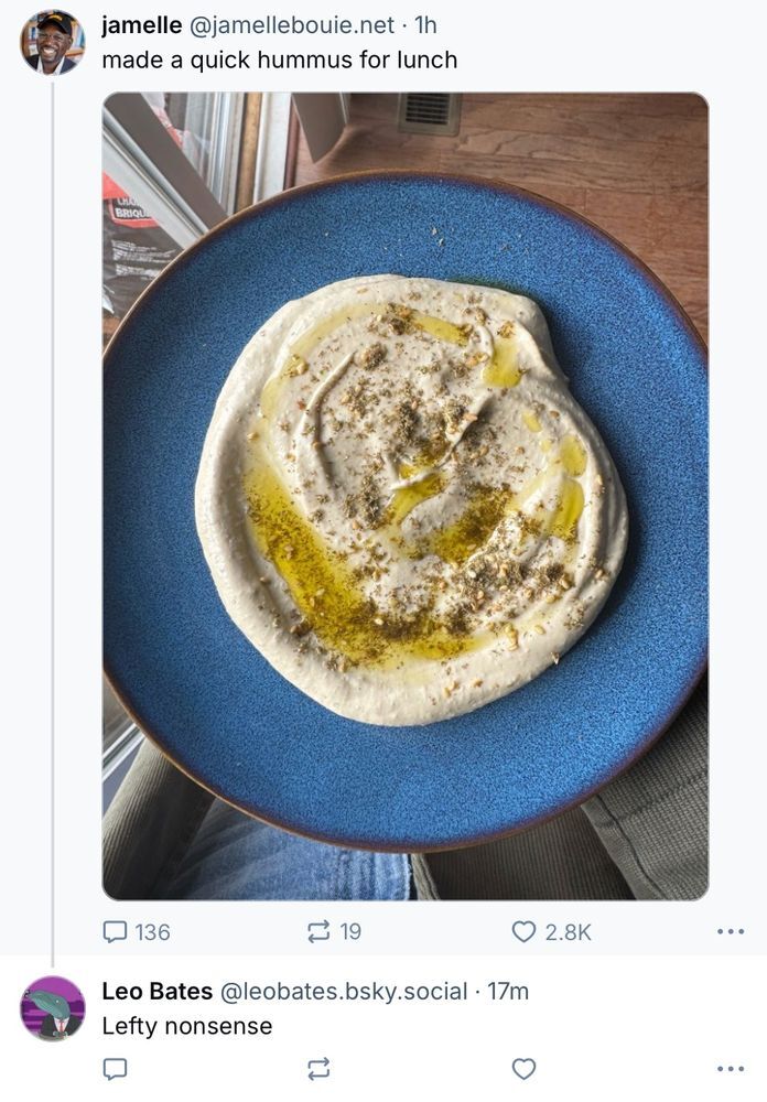 I assumed the original poster is left handed and making nonsensical left handed hummus swirls.