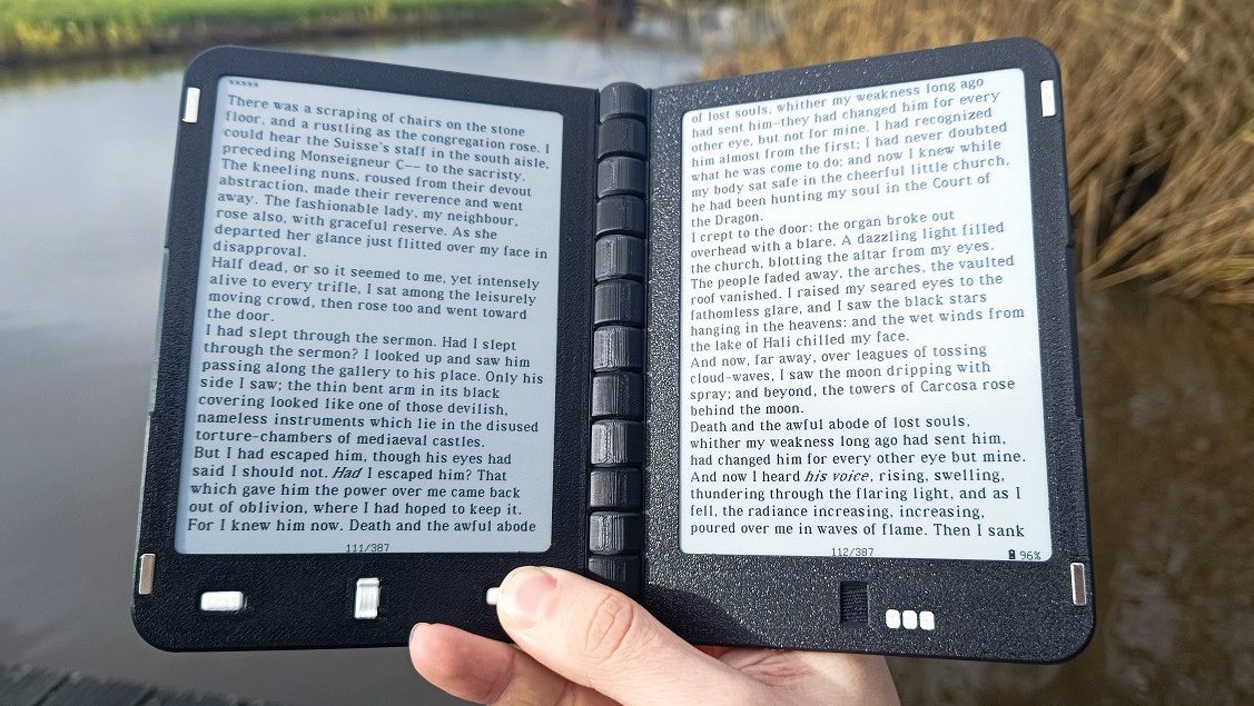 Most of what I use my readers for are reflowable text like epubs… But I guess if you could show a single page from a PDF across both screens then it might actually be big enough to be able to read while still being pocketable… You would probably want to go with the high resolution e-ink screens, like the one in the Kobo Clara HD (1072 x 1448). A combined resolution of two of those would be 2144 x 1448,