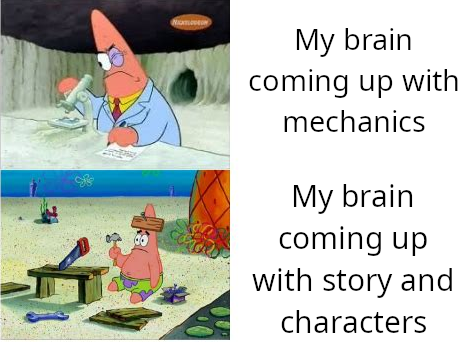 My brain coming up with mechanics: (smart) Patrick from Spongebob Squarepants looking through a microscope, taking some notes