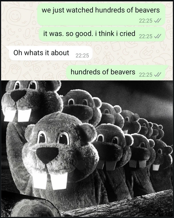 Gormadt@lemmy.blahaj.zone to 196@lemmy.blahaj.zoneEnglish · 14 days agoHundreds of Beavers [Rule]lemmy.blahaj.zoneimagemessage-square14linkfedilinkarrow-up1253arrow-down15