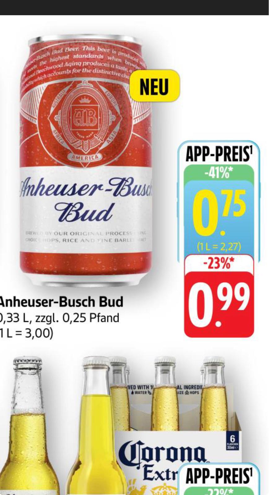 I looked up the price locally for me (Washington state, hence the asterisk) at the Kroger-affiliated Fred Meyer, and it was on sale for $23 for a 24 pack of Budweiser. That boils down to €0.81 per can.