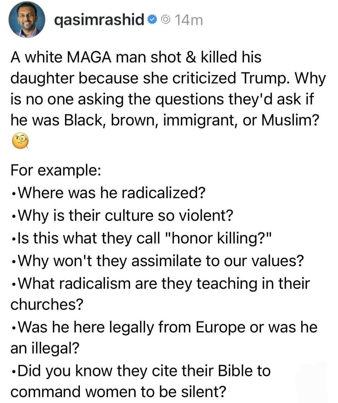 Oh, and “What charges will be lodged against him for shooting his daughter?”
