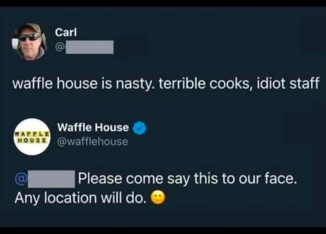 Waffle House with the “Say it to my face, bitch!”