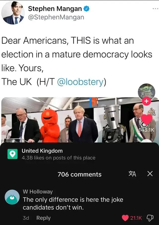 7·10 个月前Nige has them running scared. A nonaggression pact would be the start of a slippery slope, one that could see Farage running the country. 😱