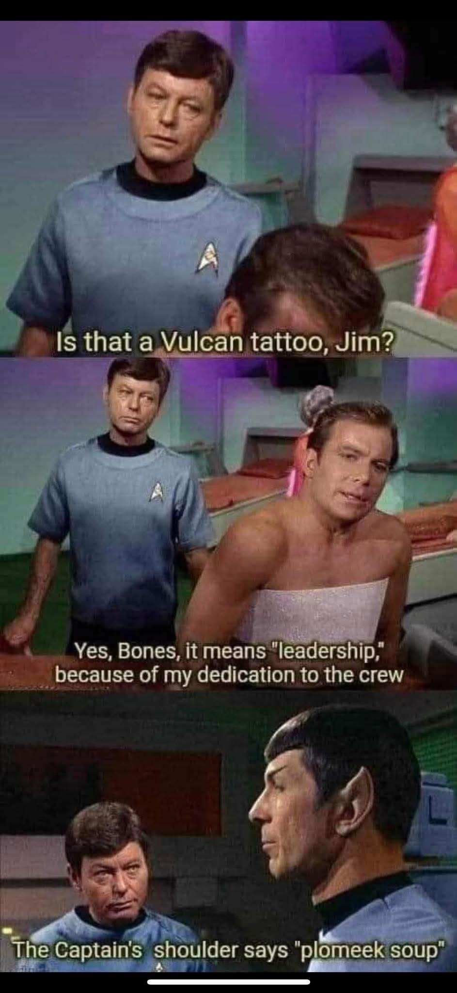 and B - Do you also think that every meme featuring Kirk should have some indication that he’s speaking in Shatner’s distinctive cadence? If it was Sisko, Avery Brooks projecting to the rafters like he’s in a stage play? What about Kate Mulgrew’s mid-Atlantic accent for Janeway?